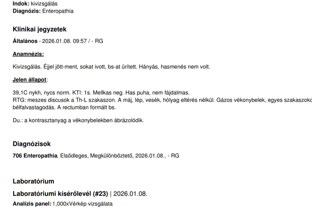 1. általános állapot: élénk, eszik, iszik, ma sokat ivott, láztalan