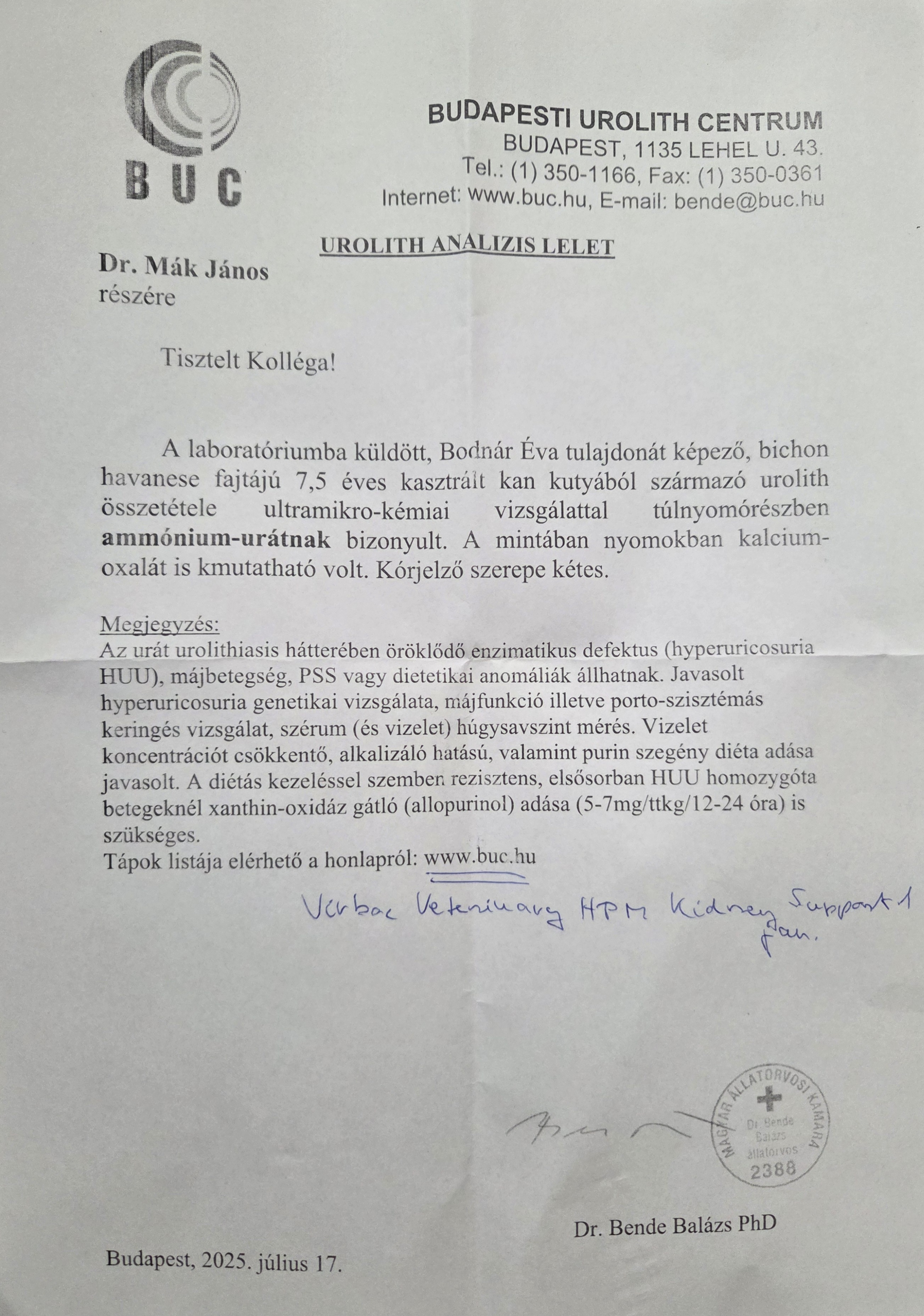 Azóta sikerült a labort is megcsináltatni, úgyhogy csatolnám újra a kő vizsgálatának az eredményét és a labor vizsgálatának az eredményét is. A laborban is van sajnos egy csúnya eredmény, amit majd csak holnap tudok az orvosunkkal megbeszélni.