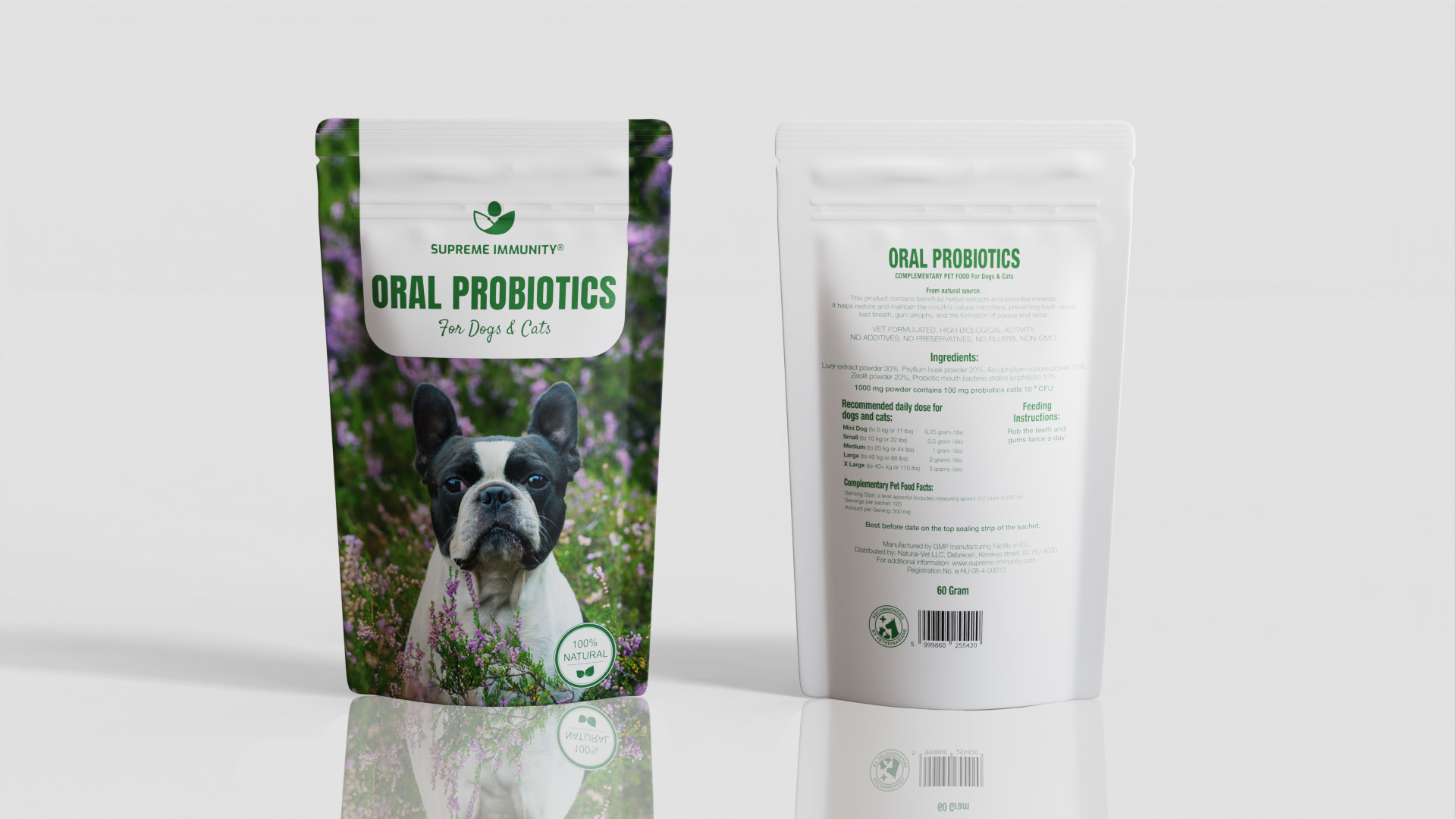 KIEGÉSZÍTŐ ÁLLATELEDEL KUTYÁK ÉS MACSKÁK RÉSZÉRE. 100%-BAN TERMÉSZETES. ÁLLATORVOSI TAPASZTALATOK ALAPJÁN ÖSSZEÁLLÍTOTT KÉSZÍTMÉNY, MELY JÓTÉKONY HATÁSÚ NÖVÉNYI KIVONATOKAT ÉS ÁSVÁNYI ANYAGOKAT ÉS KISÁLLAT SZÁJÜREGI PROBIOTIKUMOKAT TARTALMAZ. Segít helyreállítani és fenntartani a száj természetes mikroflóráját, megelőzve a fogszuvasodást, a rossz leheletet, a fogínysorvadást, valamint a lepedék és fogkő képződését. Alkalmazási lehetőségek: A termék alkalmazása nem helyettesítheti az állatorvosi diagnózist. Alkalmazható az egészséges állapot fenntartására, továbbá az alábbi betegségek állatorvos által javasolt kezelésének támogatására a következő esetekben: száj nyálkahártya gyulladás, ínygyulladás, ínysorvadás, afták, szájfekélyek fogzománc gyengülés, fogkövesedés, lepedék képződés, szuvasodás és ezek kialakulásának megelőzése esetében. Összetevők: Liver extract powder 30%, Psyllium husk powder 20%, Ascophyllum nodose power 20%, Zeolit powder 20%, Probiotic mouth bacteria strains lyophilized 10% 1000 mg por 100 mg probiotikus sejtet tartalmaz 10 ⁹ CFU Beltartalom – egy csapott, a tasakban mellékelt adagoló kanálnyiban – 0,5 grammban (0,545 ml-ben), 120 csapott kis adagoló kanálnyit tartalmaz. Minőségi paraméterek: Nem tartalmaz adalékanyagot, színezéket, töltelékanyagot, tartósítószert. GMO mentes! Javasolt alkalmazás: Kutyáknak és macskáknak Mini kutya (5 kg -ig) 0,25 gramm naponta Kicsi (10 kg-ig) 0,5 gramm naponta Közepes (20 kg-ig) 1 gramm naponta Nagy (40 kg-ig ) 2 gramm naponta Extra nagy (40 kg felett) 3 gramm naponta Ellenjavallat: Nem ismert, de a készítmény bármely összetevőjére való túlérzékenység esetén használatát fel kell függeszteni. Nem helyettesíti a változatos és kiegyensúlyozott étrendet! Eltarthatóság: Gyártástól számított 2 évig. Gyártási szám és idő a zacskó zárásán található. Mellékhatás: Nem ismert Tárolás: Gyermekek elől elzárva tartandó! Száraz, hűvös helyen, fénytől védve, 20 °C alatt tárolandó. A termék kizárólag természetes eredetű anyagokat tartalmaz, ezért a levegő páratartalmától óvni szükséges. A tároló zacskót minden használat után gondosan le kell zárni a nedvszívás elkerülése végett. Származási hely: Európai Unió Forgalmazza és címkézi: Natural-Vet Kft. 4030 Debrecen, Kerekes Ferenc u. 33. Tel. +36703354240 reg. szám.: α HU 08-4-00010 60 gramm zacskónként (nedvszívó gél tasakkal ellátott, garancia záras, felállítható tasakban) Adagolási útmutató Supreme Immunity hivatalos oldala